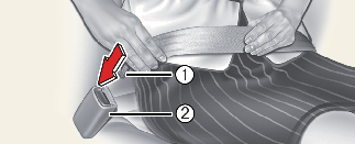 To fasten a 2-point static type belt, insert the metal tab (1) into the locking buckle (2). There will be an audible "click" when the tab locks into the buckle.