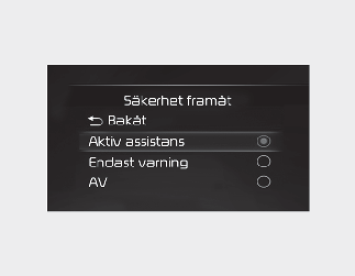 Om du väljer “Aktiv assistans” kommer funktionen att varna föraren med ett varningsmeddelande, en hörbar signal och rattvibrationer beroende på kollisionsrisknivån. Bromsassistans kommer att tillämpas beroende på kollisionsrisken.