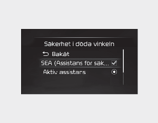 När knappen ENGINE START/STOP (motor start/stopp) är i läget ON (PÅ) ska du välja eller välja bort ”Driver Assistance (förarassistans) → Blind-Spot Safety (säkerhet i döda vinkeln) → Safe Exit Assist (assistanssystem för säker avstigning)” i menyn Settings (inställningar) för att aktivera eller inaktivera assistanssystemet för säker avstigning.