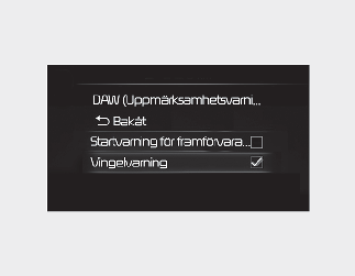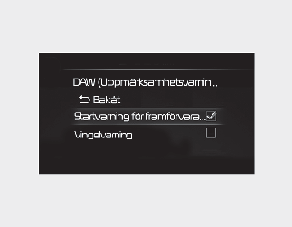 Om “Leading Vehicle Departure Alert” (Startvarning för framförvarande fordon) väljs informerar systemet föraren när framförvarande fordon börjar köra efter att ha stått stilla.