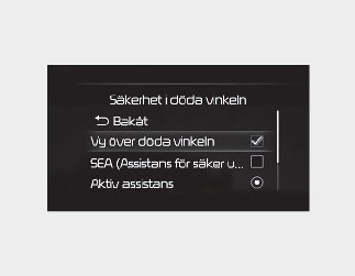 När knappen ENGINE START/STOP (motor start/stopp) är i läget ON (PÅ) ska du välja eller välja bort ”Driver Assistance (förarassistans) → Blind-Spot Safety (säkerhet i döda vinkeln) → Blind Spot View (uppsikt över döda vinkeln)” i menyn Settings (inställningar) för att aktivera eller inaktivera övervakningssystemet för döda vinkeln.