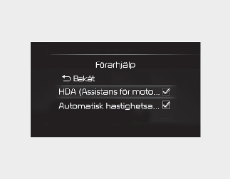 När knappen ENGINE START/STOP (motor start/stopp) är i läget ON (PÅ) ska du välja eller välja bort ”Driver Assistance (förarassistans) → Driving Assist (körassistent) → Highway Speed Change (hastighetsändring på motorväg)” från menyn Settings (inställningar) för att aktivera/inaktivera navigationsbaserad smartfarthållare.