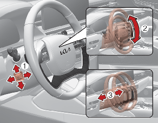 조절 스위치(1)를 움직여 스티어링 휠의 높낮이(2)와 앞뒤(3) 위치를 조절하십시오.