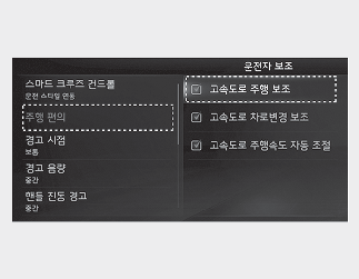 시동 'ON' 상태에서 인포테인먼트 시스템의 설정 → 차량 → 운전자 보조 → 주행 편의를 차례로 선택하십시오. 각 기능의 사용 여부를 설정할 수 있습니다.
