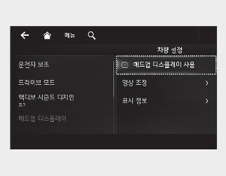인포테인먼트 시스템 '설정 → 차량 → 헤드업 디스플레이'에서 헤드업 디스플레이 기능을 설정/해제 할 수 있습니다.