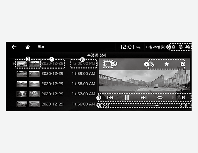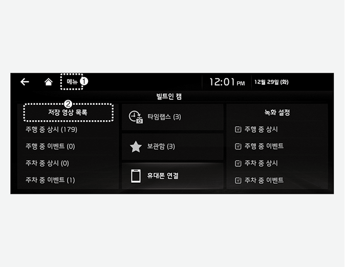 차량의 시간을 변경하는 경우 저장 파일의 순서가 뒤바뀔 수 있습니다. 차량의 시간을 변경하기 전에 저장된 파일 순서에 문제가 없는지 확인하십시오.