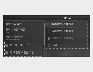 인포테인먼트 시스템의 설정 메뉴에서 선택한 속도 조건에 따라 지능형 헤드램프의 초기 설정은 40 km/h 이상 작동으로 되어 있습니다.