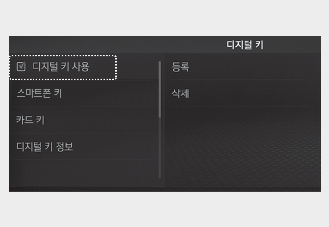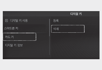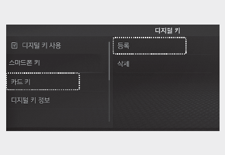 * 인포테인먼트 전체 메뉴 화면에서 '설정→차량→디지털 키→카드 키' 하위 메뉴로 이동하여 '등록'을 누르십시오.