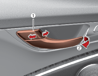 도어 잠금 스위치(1)를 당겨 해제 위치에 놓은 후 도어 손잡이(2)를 당기십시오.