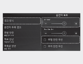 주행 안전 우선: 인포테인먼트 시스템의 '설정 → 차량 → 운전자 보조 → 경고 방식 → 주행 안전 우선'을 설정하면 안전한 주행을 위해 경고음 발생 시 오디오 음량을 줄입니다.