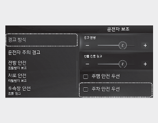 경고 방식을 변경하면 다른 운전자 보조 시스템의 경고 방식도 같이 변경될 수 있습니다. 고려하여 변경하십시오.
