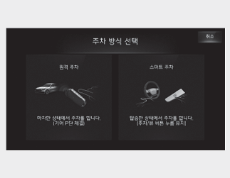 2. 주차 기능 - 스마트 주차, 원격 스마트 주차 운전자가 주차유형을 선택하면 원격 스마트 주차 보조는 인포테인먼트 시스템 화면에 원격 스마트 주차 기능과 스마트 주차 기능 조작 안내를 표시합니다. 운전자는 안내에 따라 원격 스마트 주차 보조를 조작하십시오.