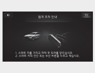 ) 버튼을 누르거나 인포테인먼트 시스템 안내 화면의 「 취소 」 를 선택하면 원격 스마트 주차 보조는 주차 기능을 종료합니다.