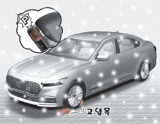 매우 추운 날씨의 주정차 시 주차 브레이크를 걸어 놓으면 브레이크 장치가 얼어 붙어버릴 우려가 있으므로 주차 브레이크는 가능한 풀어 놓은 상태에서 주차하십시오. 경사없는 평지에 변속 레버를 「P」(주차) 위치로, 타이어에는 고임목을 받쳐 차가 움직이지 않도록 하십시오.