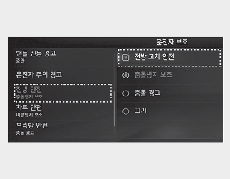 시동 ‘ON’상태에서 인포테인먼트 시스템의 설정 → 차량 → 운전자 보조 → 전방 안전을 차례로 선택하십시오. 각 기능의 사용 여부를 설정할 수 있습니다.