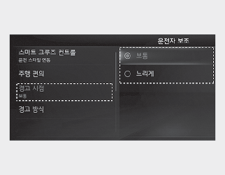 낮은 속도로 주행하거나 주변 차량이 적을 경우에만 경고 시점을 '느리게'로 설정하십시오.