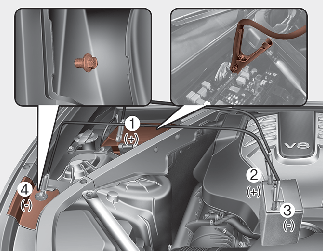 * 차량의 배터리는 트렁크 하단에 있지만 점프 스타트 시에는 엔진룸에 있는 점프스타트 단자를 이용하십시오. 엔진룸 점프 단자로 점프 스타트 불가시 트렁크룸내 배터리 단자를 이용하십시오.