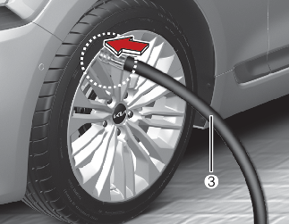 손상된 타이어의 휠 공기 주입구 캡을 풀어 실런트 주입 호스(3)를 휠 공기 주입구에 연결하여 고정하십시오.