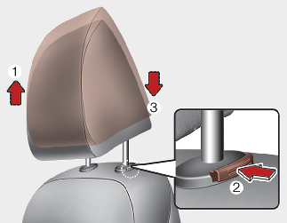 Чтобы поднять подголовник, вытяните его вверх до требуемого положения (1). Чтобы опустить подголовник, нажмите и удерживайте кнопку фиксатора (2), а затем опустите подголовник в требуемое положение (3).