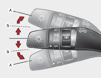 Слегка поверните рычаг включения указателей поворота и удерживайте его в положении (B).