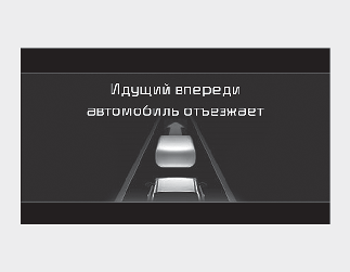 Когда впереди стоящий автомобиль начинает движение, функция контроля отъезда впереди стоящего автомобиля оповещает водителя с помощью сообщения «Идущий впереди автомобиль отъезжает» на приборной панели и звукового предупреждения.