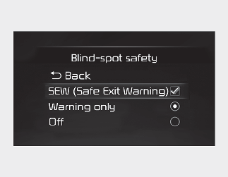 With the ENGINE START/STOP button in the ON position, and select 'User settings (LCD display) or Settings → Vehicle (Infotainment System screen) → Driver assistance → Blind-spot safety → SEW (Safe Exit Warning)' to turn on Safe Exit Warning and deselect to turn off the function.