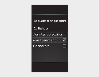 Le réglage du délai d’avertissement s'applique à toutes les fonctions du système de sécurité d'angle mort.