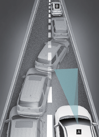 When a vehicle (B) moves into your lane from an adjacent lane, it cannot be detected by the sensor until it is in the sensor's detection range. Smart Cruise Control may not immediately detect the vehicle when the vehicle changes lanes abruptly. In this case, you must maintain a safe braking distance, and if necessary, depress the brake pedal to reduce your driving speed in order to maintain a safe distance.