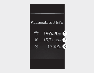 Ta zaslon prikazuje razdaljo potovanja (1), povprečno učinkovitost goriva (2) in informacije o skupnem času vožnje (3) glede na en cikel vžiga.