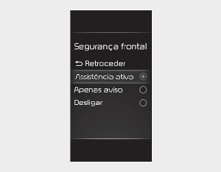 Se selecionar "Active Assist" (Assistência ativa), o FCA é ativado. O FCA emite mensagens e alarmes de aviso consoante os níveis de risco de colisão. Além disso, ele controla os travões, de acordo com os níveis de risco de colisão.
