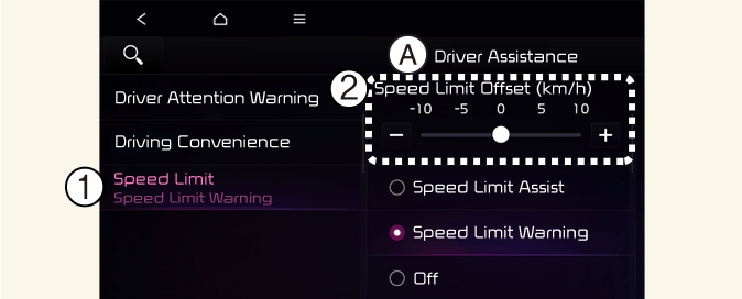 Nopeusrajoitus ja nopeusvaroitustoiminto toimivat nopeusrajoitukseen lisätyn korjausarvon perusteella. Aseta korjausarvo arvoon 0 vaihtaaksesi nopeutta tai varoittaaksesi nopeudesta havaitun nopeusrajoituksen mukaisesti.