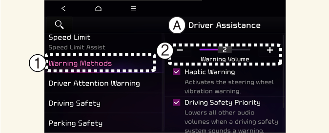 Hlasitosť výstrahy: Zvoľte Používateľské nastavenia → Asistenčný systém → Hlasitosť varovania na prístrojovej doske alebo zvoľte Nastavenia → Vozidlo → Asistenčný systém → Metódy varovania → Hlasitosť varovania na informačnom systéme a upravte hlasitosť varovania.