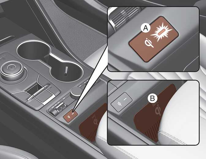 스마트폰을 충전하기 위해서는 차량의 도어를 모두 닫고 시동 스위치 ON 상태에서 무선충전이 지원되는 스마트폰을 무선 충전 패드 슬롯(B)에 꽂으시면 충전 가능합니다.