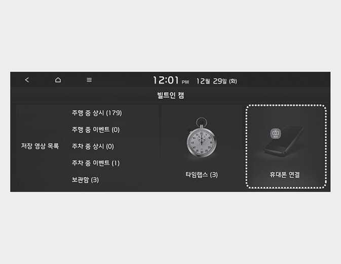인포테인먼트 시스템 홈 화면에서 빌트인 캠 선택 후, 휴대폰 연결을 선택하여 스마트폰 연결이 가능한 상태로 만드십시오.