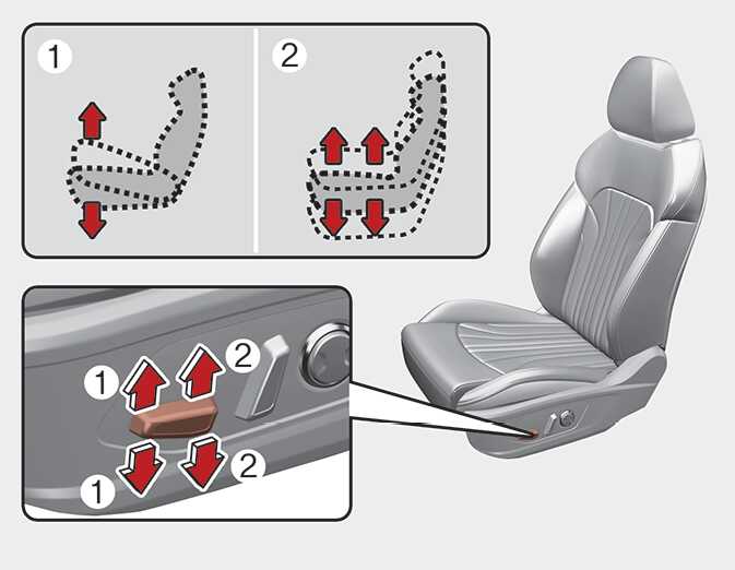 조절 스위치의 앞쪽(1)을 올리거나 내리면 좌석의 앞부분이 올라가거나 내려오고 , 조절 스위치의 뒷쪽(2)을 올리거나 내리면 좌석 전체가 올라가거나 내려옵니다 .