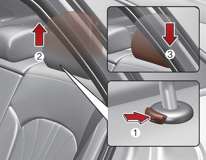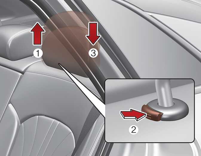 내릴 때는 잠금해제 버튼(2)을 누른 상태에서 헤드레스트를 위에서 누르십시오(3).