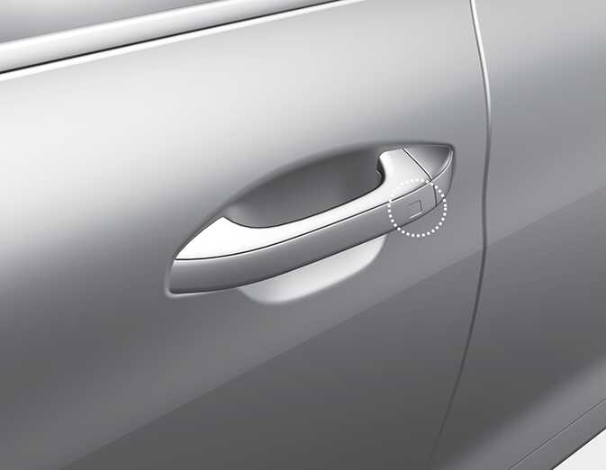 스마트 키를 휴대하고 앞좌석 도어의 바깥 손잡이에 있는 도어 잠금/잠금 해제 버튼(버튼 타입의 경우)을 누르거나 앞좌석 도어의 바깥 손잡이에 있는 음각 부분으로 되어 있는 도어 잠금 센서부(터치센서 타입의 경우)를 터치하십시오.