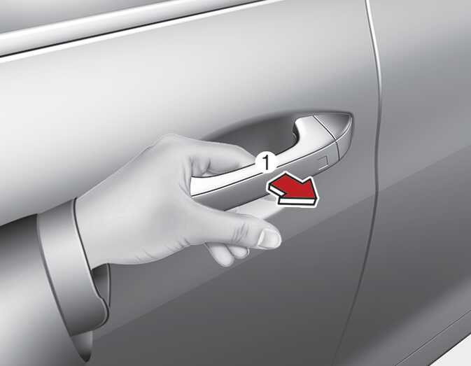 스마트 키를 휴대하고 앞좌석 도어의 바깥 손잡이에 있는 도어 잠금/잠금 해제 버튼(버튼 타입의 경우)을 누르거나 도어 핸들 포켓(1) 안에 손을 넣어 바깥 손잡이 안쪽에 위치한 도어 잠금 해제 센서부(터치센서 타입의 경우)를 터치하십시오.