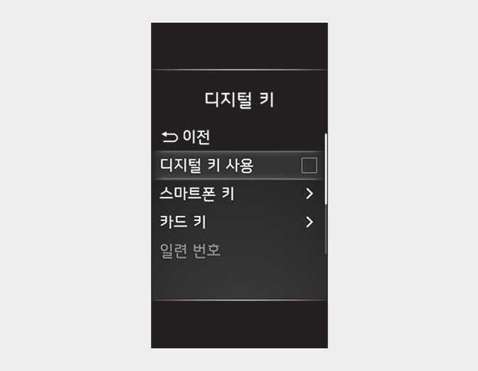디지털 키(스마트폰, 카드) 기능 사용을 원하지 않을 경우 기능 차량의 디지털 키 기능을 일시적으로 중지할 수 있습니다. 스마트 키를 소지 후, 차량의 디지털 키 메뉴에서 설정을 변경하십시오.