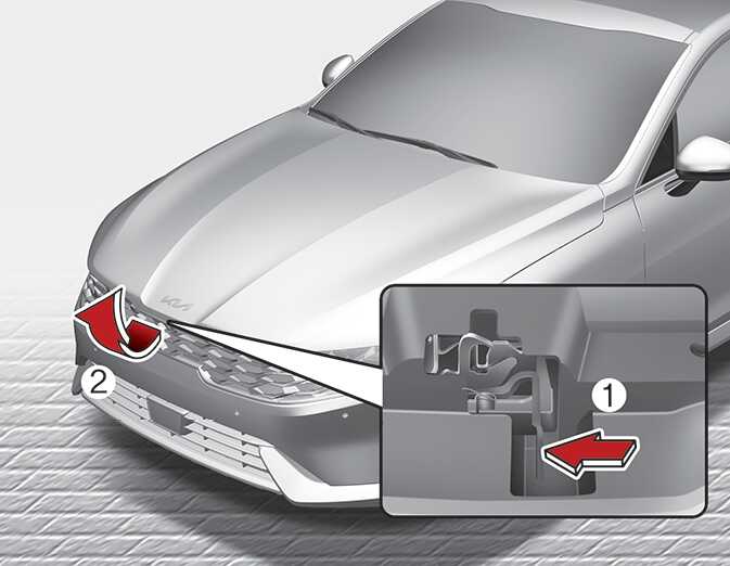 차량의 앞에서 엔진 후드를 약간 들어 올리고, 중앙에 위치한 잠금레버(1)를 왼쪽으로 밀고 있는 상태에서 후드(2)를 위로 들어 올리십시오.
