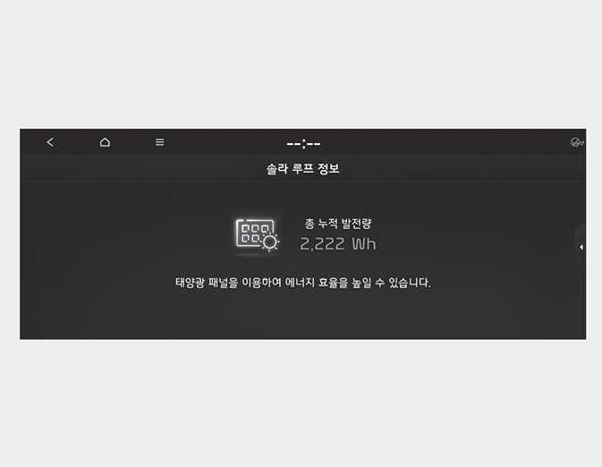 인포테인먼트 시스템 메뉴에서 솔라루프 정보를 선택하면 솔라루프의 누적된 배터리 충전량을 확인할 수 있습니다.