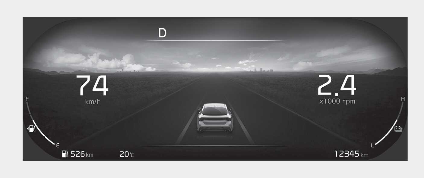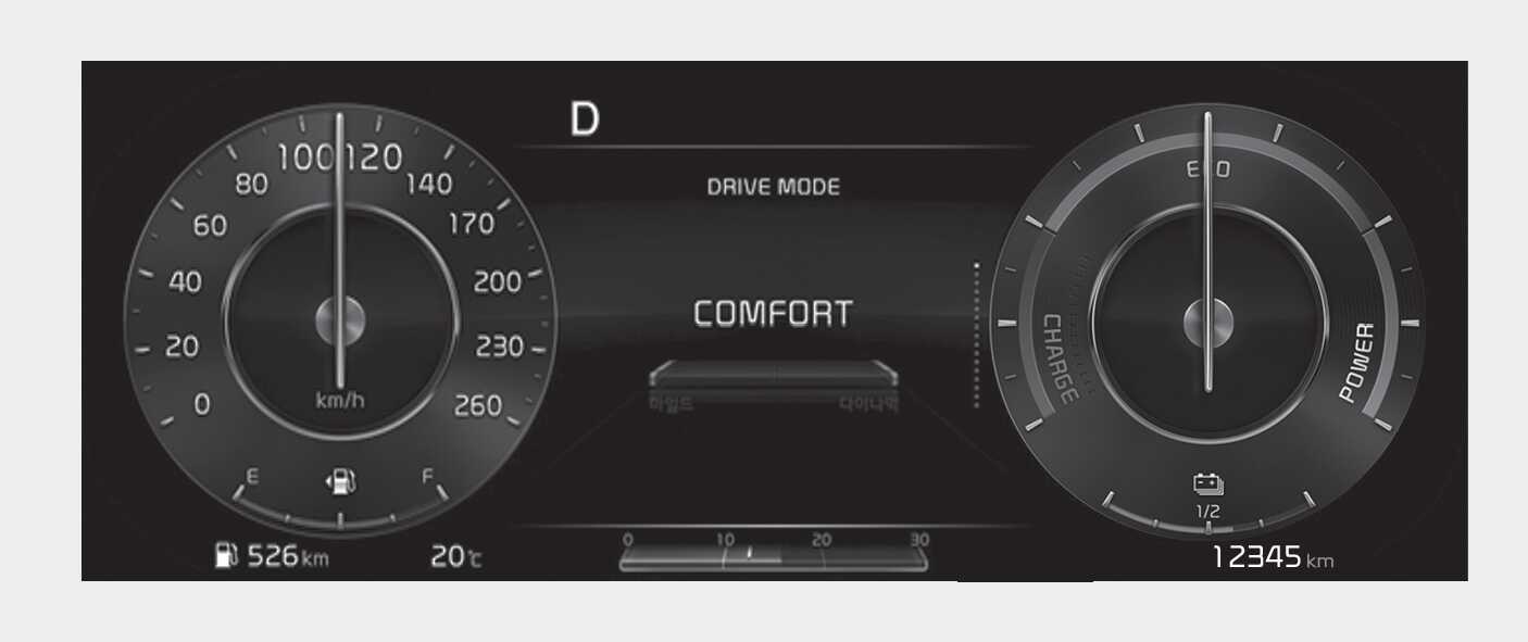 테마 A는 Full LCD 타입 계기판의 기본 테마로 드라이브 모드에 따라 특색 있는 그래픽 스타일을 제공합니다.