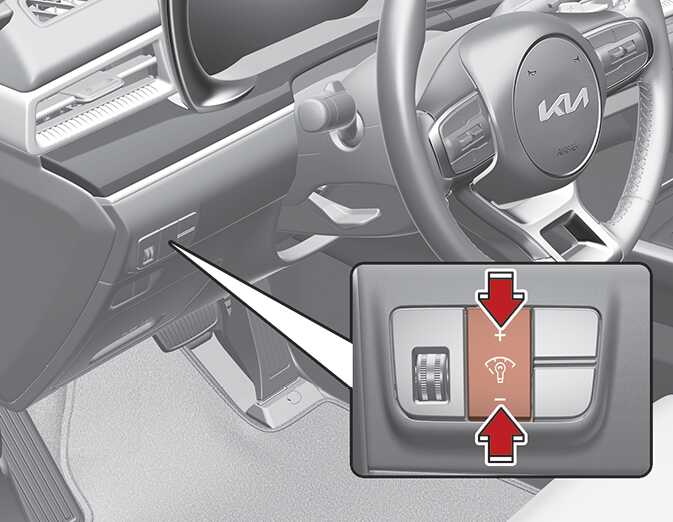 조명 스위치 미등 이상 또는 시동 「ON」 이상에서 계기판 조명 밝기 조절 스위치를 위쪽 또는 아래 쪽으로 눌러 계기판 조명의 밝기를 조절할 수 있습니다.