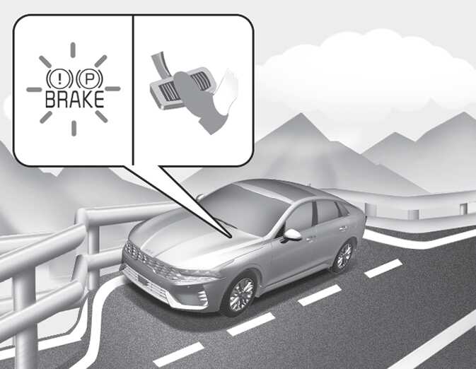 브레이크 경고등이 켜지면 페달이 딱딱해져 제동이 힘들 수 있습니다. 이 경우에는 평상시보다 강하게 밟아 정지시켜야 합니다.