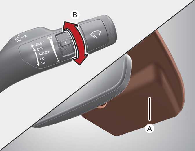 ODL30494160차 안 중앙 앞 유리 상단에 설치된 센서(A)에서 비의 양을 감지하여 비의 양이 많아지면 와이퍼 작동 속도가 빨라지고, 비의 양이 적어지면 느려지다가 비가 멈추면 작동도 멈춥니다. 와이퍼 속도조절을 변경하고자 할 때는 속도 조절 노브(B)를 돌려 조절할 수 있습니다. 위쪽으로 돌리면 속도가 빨라지고 아래쪽으로 돌리면 속도가 느려집니다.