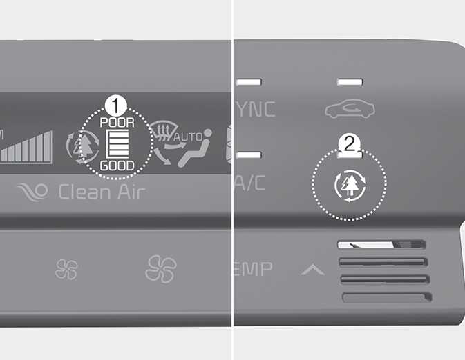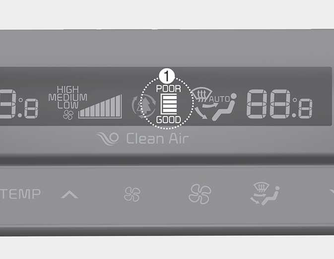 차량 내 장착된 미세먼지 센서를 이용하여 실내 미세 먼지 농도를 감지하여 작동 표시창(1)에 표시하고, 필요시 공기 청정 모드를 자동으로 작동시켜 실내 공기를 쾌적하게 유지하는 기능입니다.