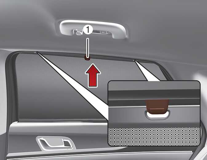 뒷좌석 도어 매뉴얼 커튼 (사양 적용시) ODL3049407 뒷좌석 유리를 통해 들어오는 외부 광선을 차단하고자 할 때 아래와 같이 사용하십시오. 커튼 고리 (1)를 잡고 올리십시오 . 장착된 양쪽 후크에 커튼을 거십시오 .