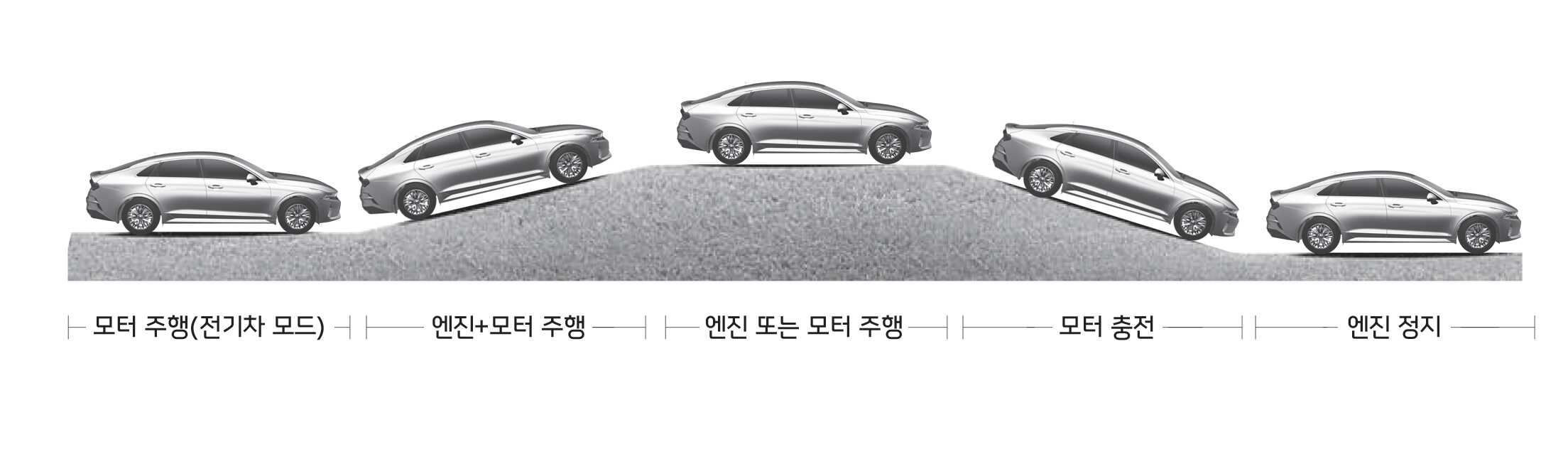 3. 엔진 또는 모터 주행 : 엔진 또는 모터로 구동 시키며, 배터리 잔량이 적정 수준 이하일 경우 충전합니다. |
