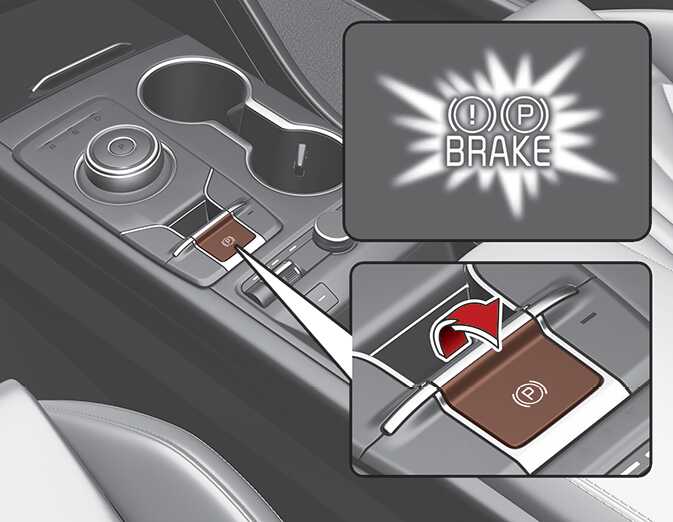 전자식 파킹 브레이크가 정상적으로 체결되면 계기판에 브레이크 경고등이 켜집니다. 전자식 파킹 브레이크(EPB)가 작동되었는지 계기판의 브레이크 경고등을 반드시 확인하십시오.