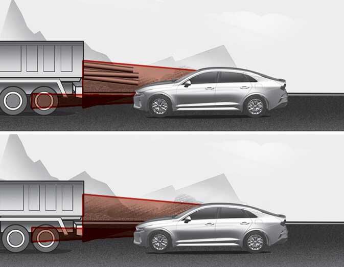 앞 차량의 차고가 높거나 적재물이 차량 후방으로 돌출되어 있는 경우, 위험 상황이 발생할 수 있으므로 주의하십시오.